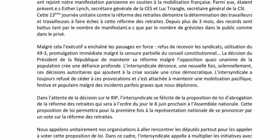 Communiqué intersyndical – Toujours unis, nombreux et déterminés pour le retrait et le progrès social.