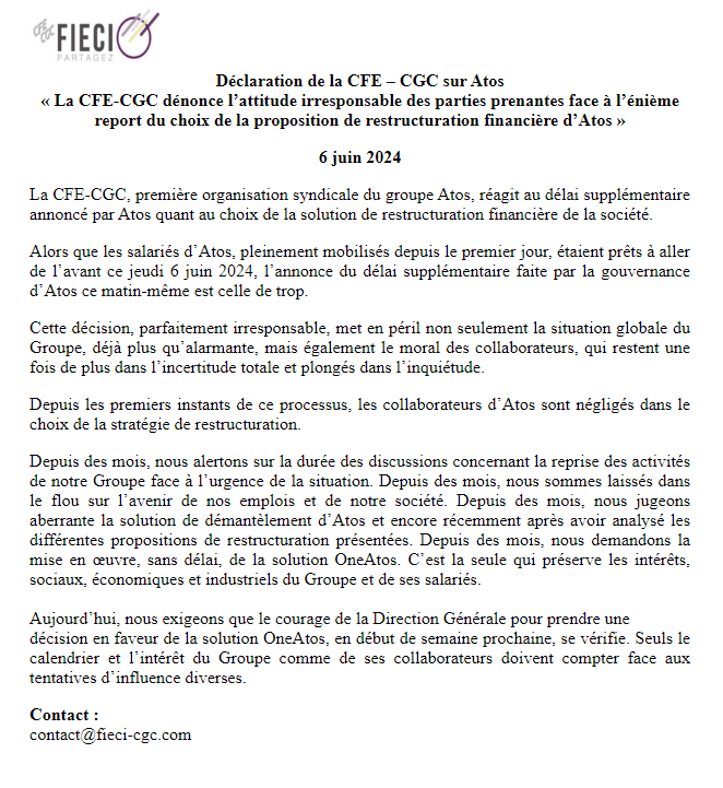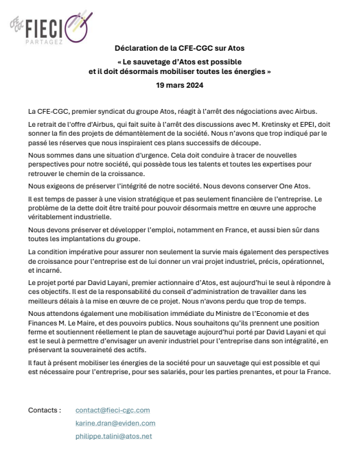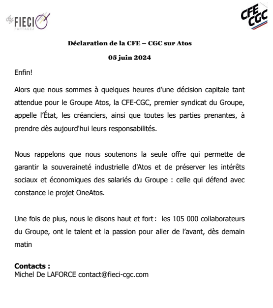 DetailsNous rappelons que nous soutenons la seule offre qui permette de garantir la souveraineté industrielle d’Atos et de préserver les intérêts sociaux et économiques des salariés du Groupe : celle qui défend avec constance le projet OneAtos. Powered by WPeMatico