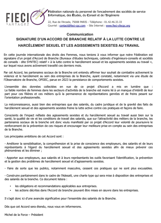 DetailsEn cette journée internationale des droits des Femmes, nous tenions à vous informer que notre Fédération est signataire d’un projet d’Accord de Branche (Bureaux d’études techniques, cabinets d’ingénieurs-conseils et sociétés de conseils – dite SYNTEC) relatif « à la lutte contre le harcèlement sexuel et les agissements sexistes au travail », sur lequel nous avons…
