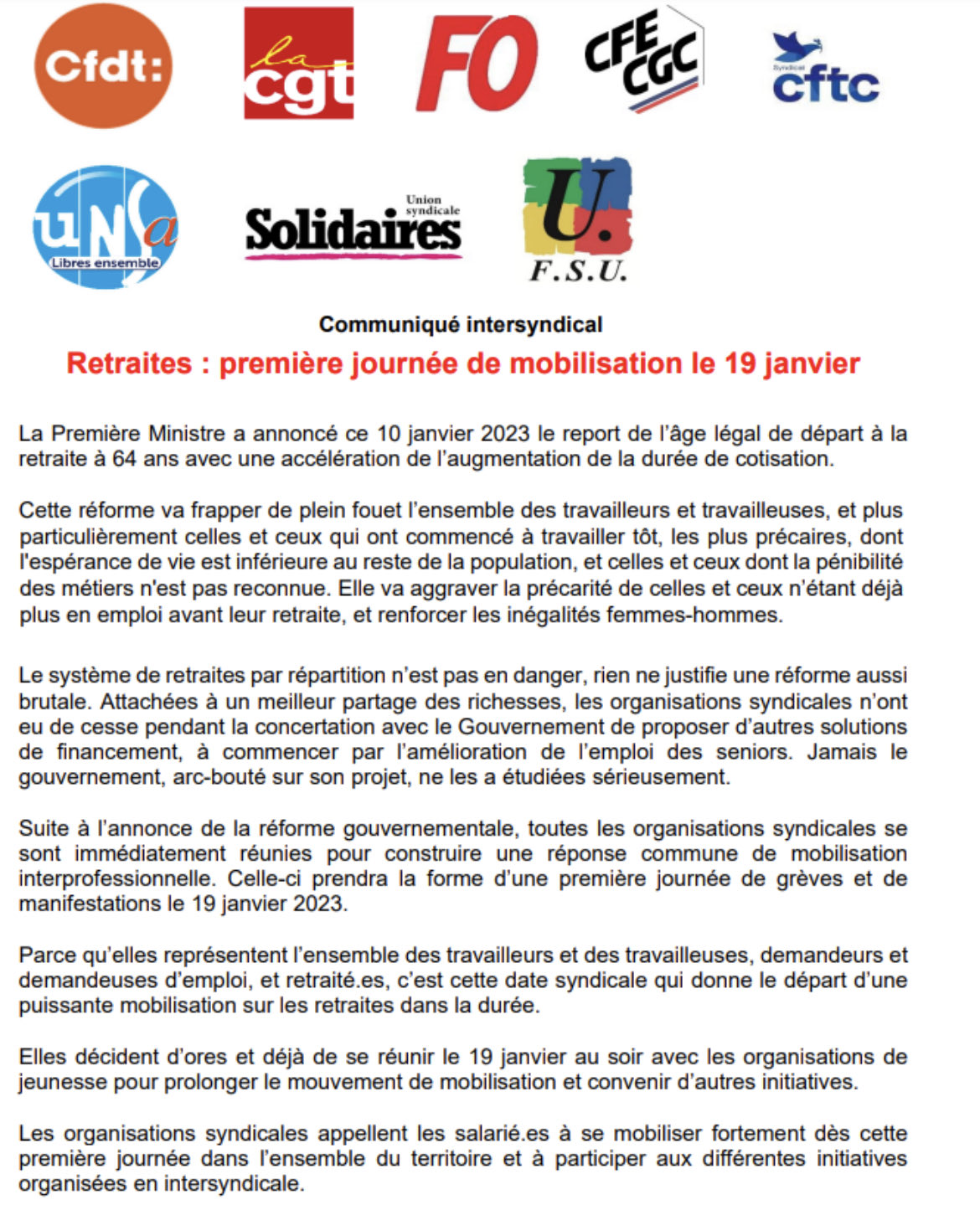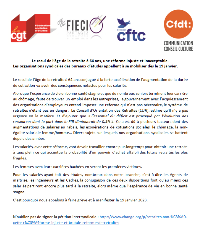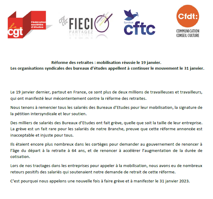 Réforme des retraites : mobilisation réussie le 19 janvier. Les organisations syndicales des bureaux d’études appellent à continuer le mouvement le 31 janvier.