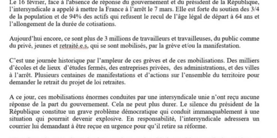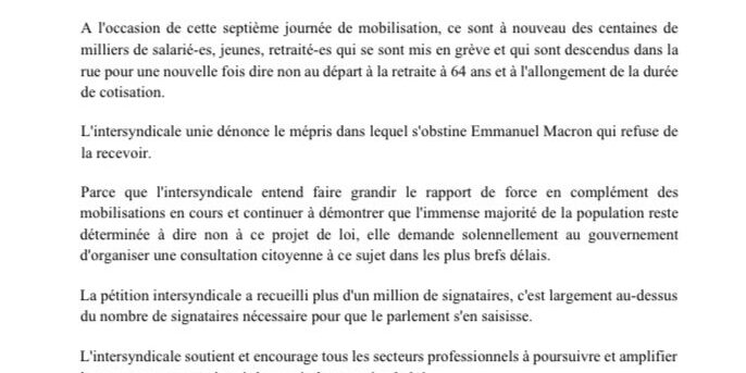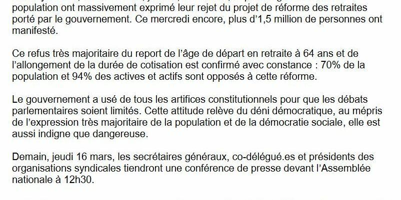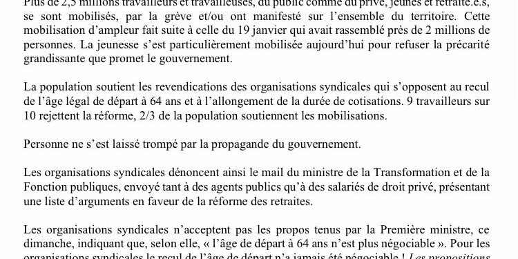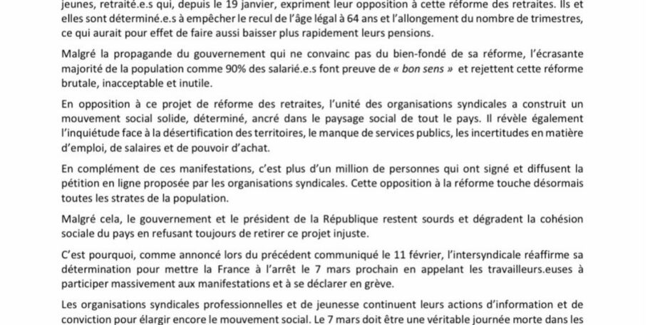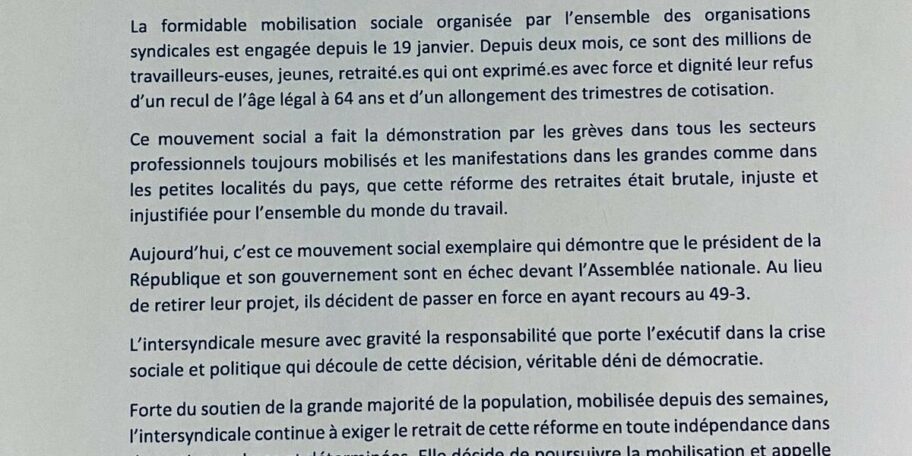 L’intersyndicale décide de poursuivre la mobilisation et appelle à des rassemblements, syndicaux de proximité ce week-end et à une nouvelle grande journée de grèves et manifestations le jeudi 23 mars prochain. Powered by WPeMatico